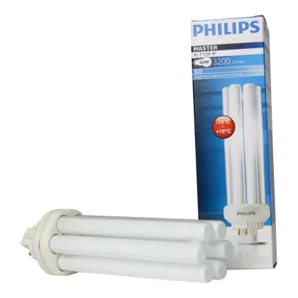 The Philips PL-T TOP 4P lamps are 4 pin socket fluorescent lamps that are very efficient for long run times. They are more efficient than 4P PL-T standard bulbs and their performance is optimized over wide temperature ranges. Philips PL-T TOP 42W 830 4P measure 1500 cm and have a GX24q-4 socket type, which corresponds to a socket with 4 pins.